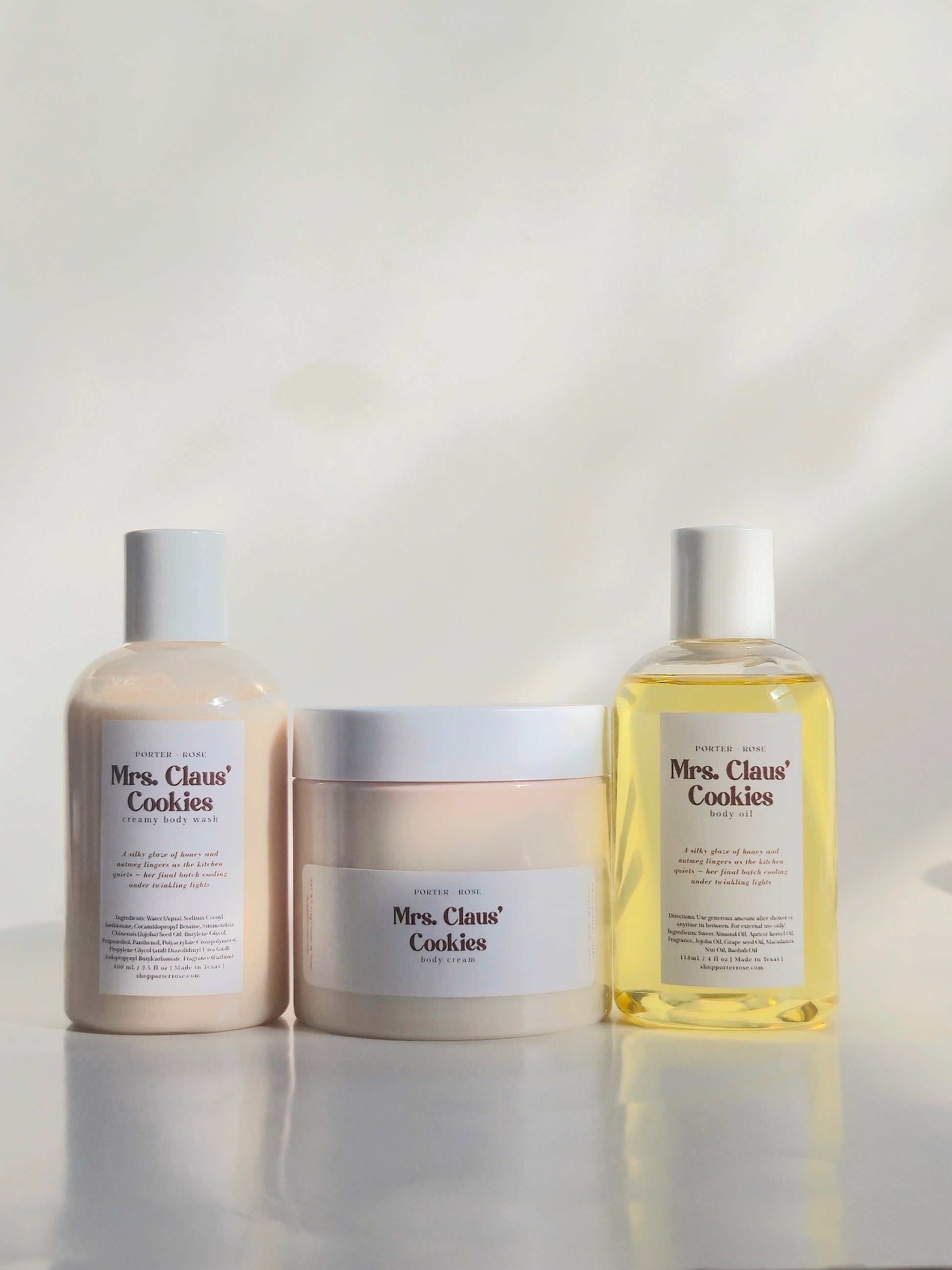 A warm and sweet cookie trio featuring a body oil, creamy body wash, and full size body cream — crafted to leave you soft, glowing, and smelling like the last (and best) batch Mrs. Claus pulls from the oven. The kind she hides for herself.