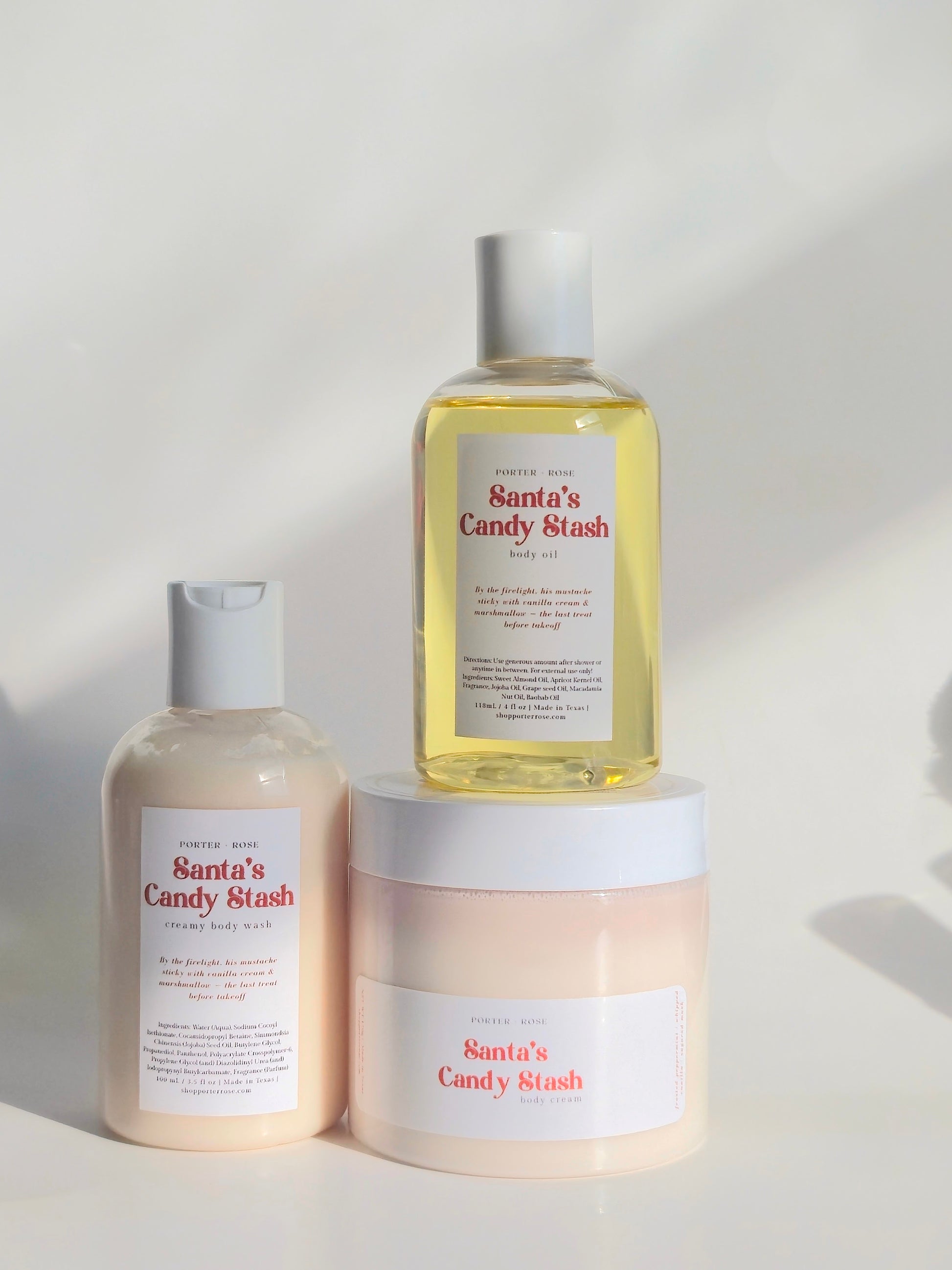 A sweet and creamy holiday trio featuring a body oil, creamy body wash, and full size body cream — crafted to leave your skin soft, glowing, and smelling like the secret treats Santa sneaks before takeoff. (You know… the ones he doesn’t share with the elves.)