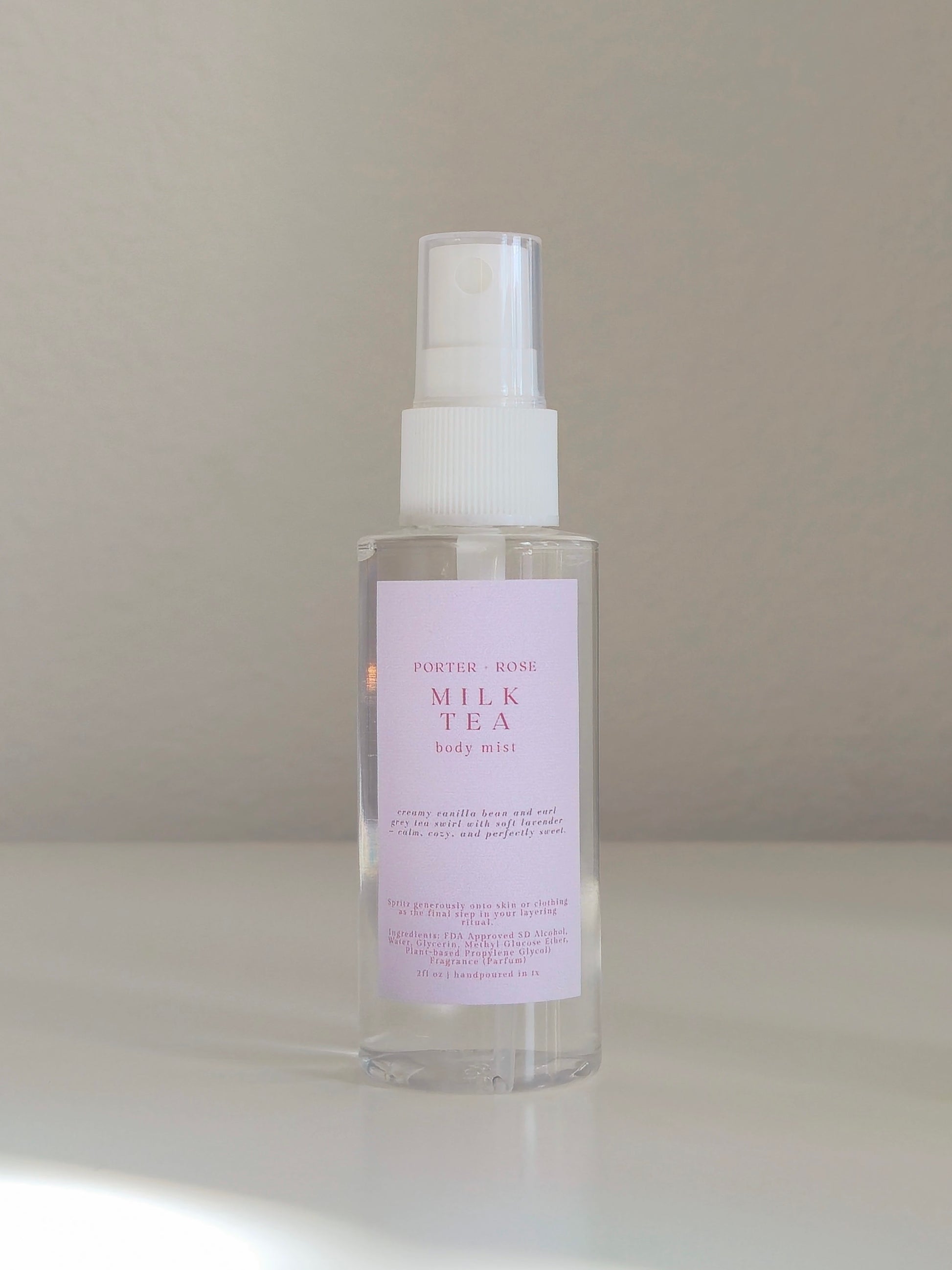 Milk Tea Body Mist: FDA Approved SD Alcohol, Water, Glycerin,Methyl Glucose Ether, Plant-based Propylene Glycol, Fragrance